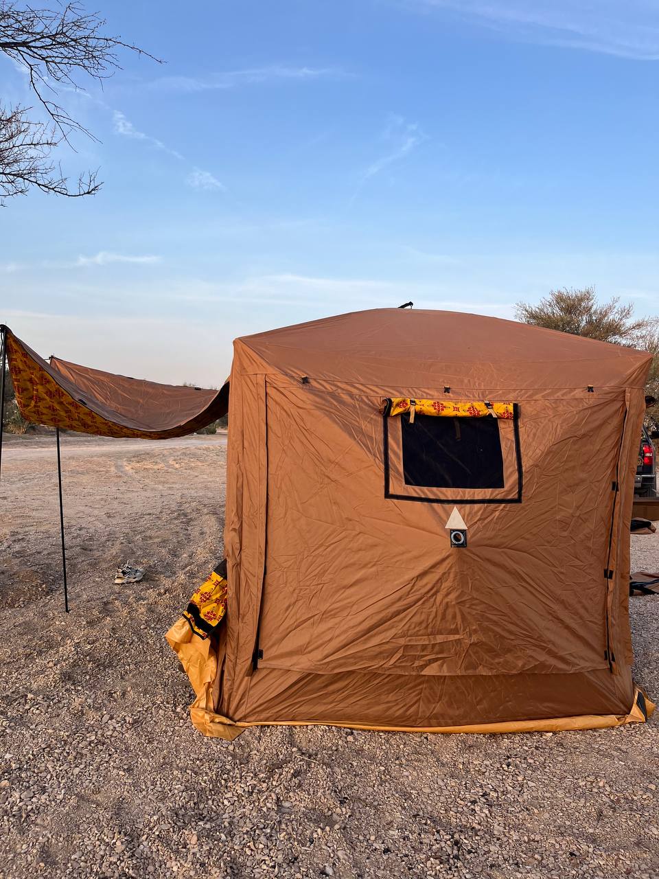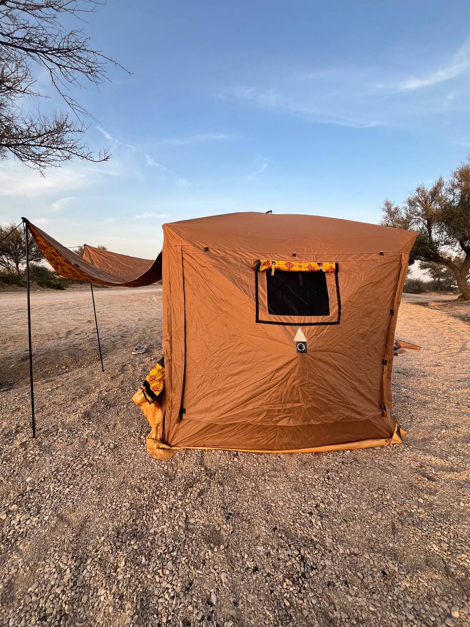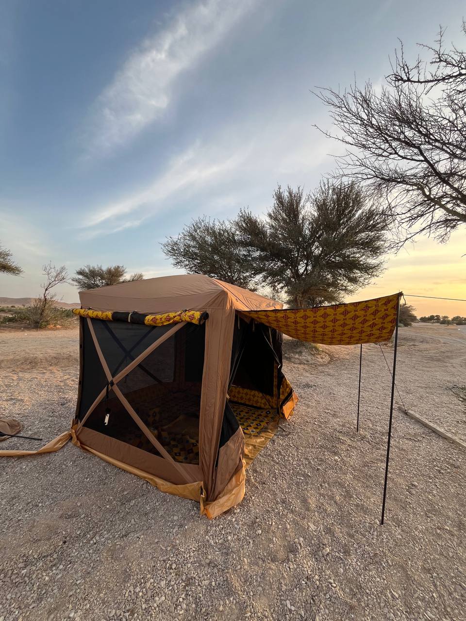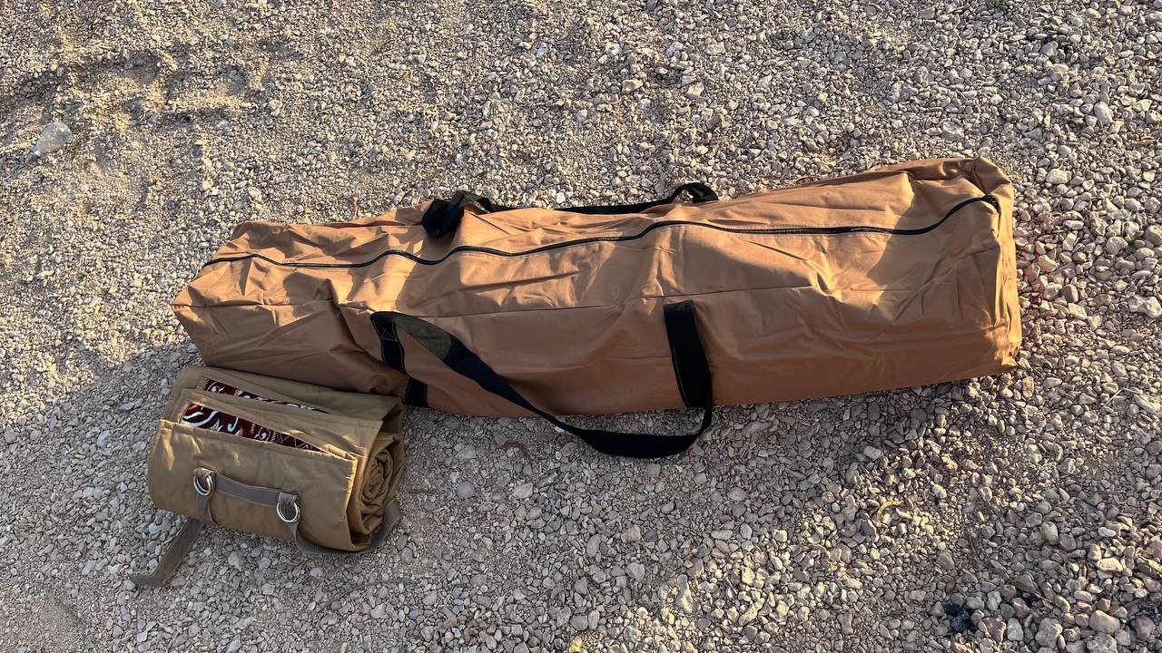 9 طنب , ومطرقة , وشنطه حافظة للأطناب , فرشة أرضية مقاومة للماء والرطوبة , شراع , وشنطه حافظة للخيمة